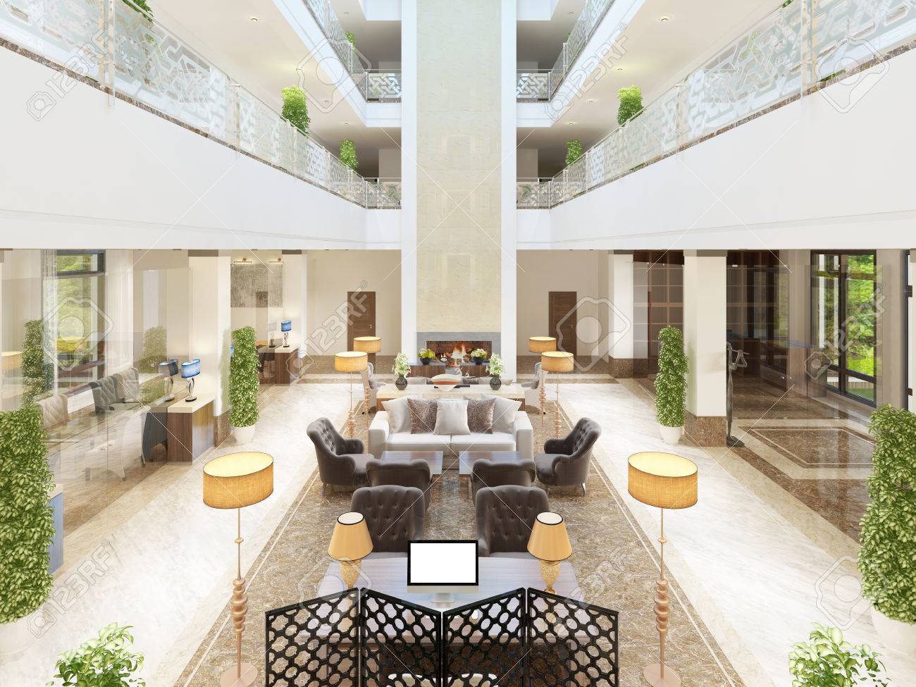 Coin Salon Design De Luxe Interieur De L Hotel Meubles Rembourres Couteux Avec Des Tables Et Des Etages Avec Des Chambres D Hotel Rendu 3d