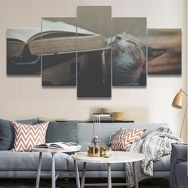 Acheter Moderne Sur Toile Peinture Salon Hd Imprime 5 Panneau Chat Et Livre Modulaire Decoration Affiches Maison Cadre Image Mur Art De 9 22 Du
