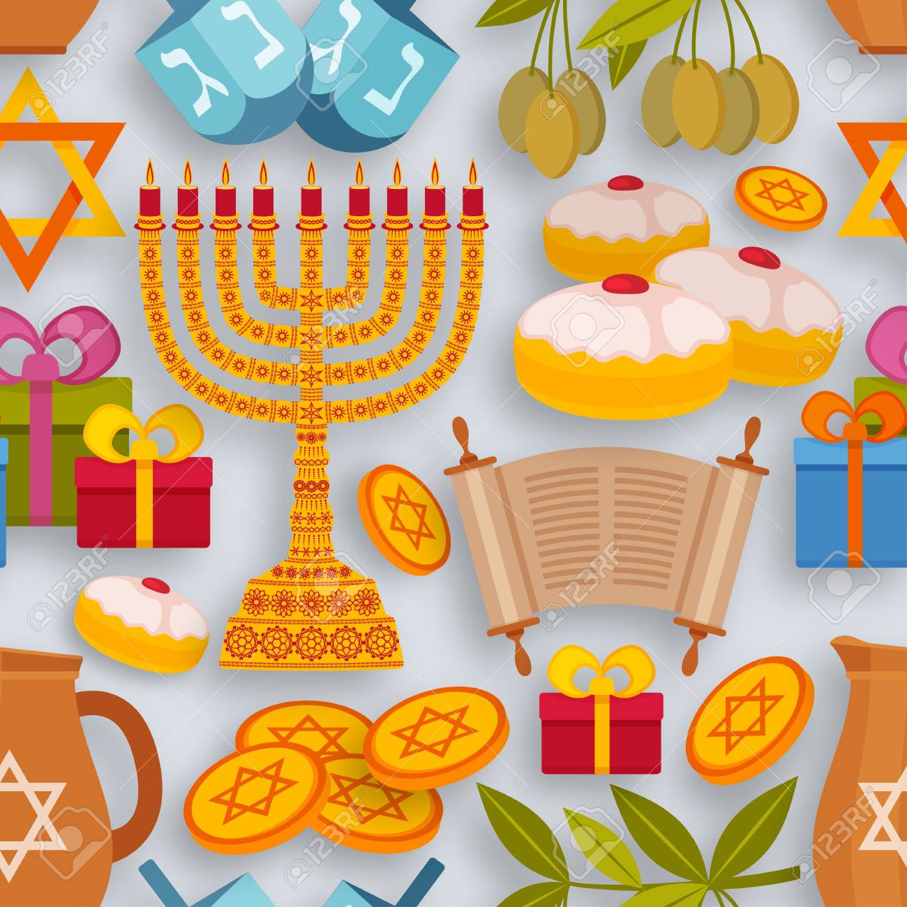 Hanukkah Seamless Pattern With Torah Menorah And Dreidels